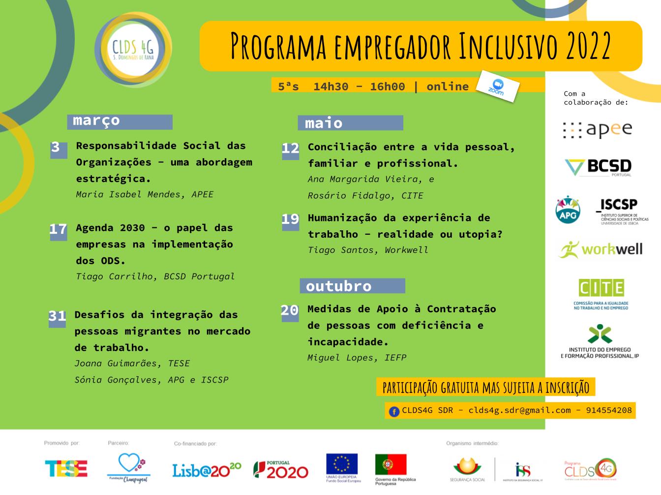 O "Programa Empregador Inclusivo 2022" é composto por 6 sessões online, gratuitas, as quais irão decorrer entre março e outubro de 2022, dinamizadas por diferentes profissionais, especialistas nos temas apresentados.